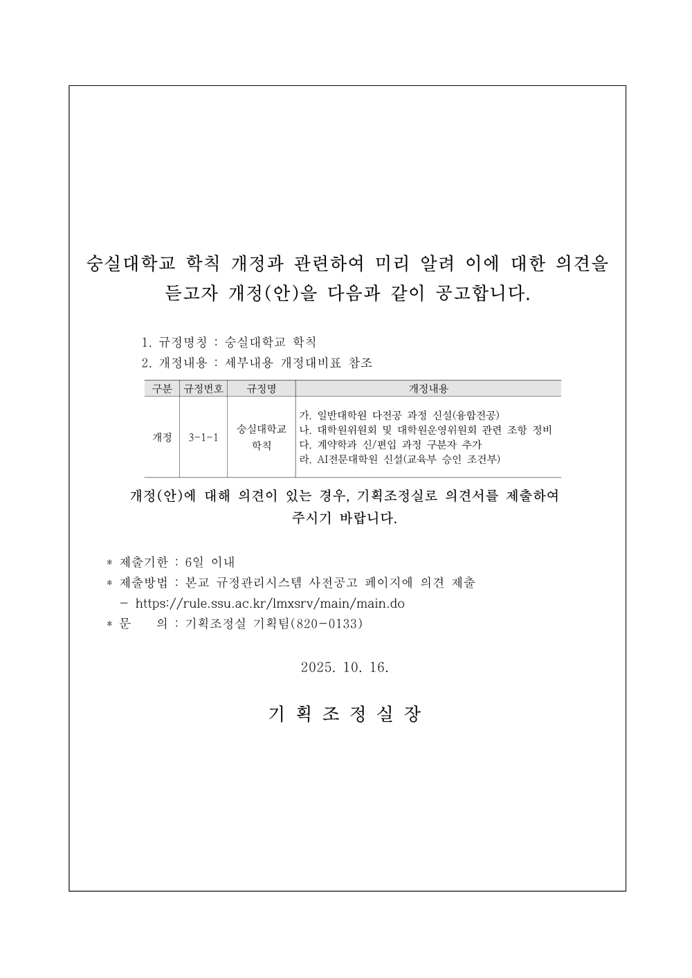 <의견 작성 방법> 1. 본교 규정 홈페이지 사전공고 게시글의 댓글 기능을 활용하여 상기 규정에 대한 의견 작성 2. 작성양식 · 작성자 소속: 교원 / 직원 / 학생 / 동문 / 기타 · 작성자 연락처(선택사항): 010-1234-5678 · 학칙 개정에 대한 간단한 의견 3. 비밀번호 입력 후 저장