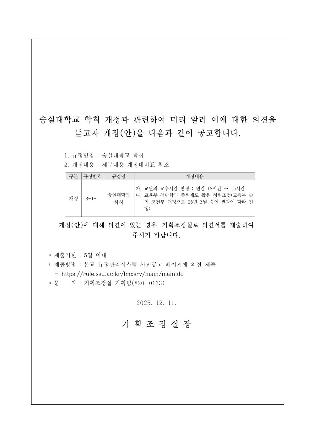 <의견 작성 방법> 1. 본교 규정 홈페이지 사전공고 게시글의 댓글 기능을 활용하여 상기 규정에 대한 의견 작성 2. 작성양식 · 작성자 소속: 교원 / 직원 / 학생 / 동문 / 기타 · 작성자 연락처(선택사항): 010-1234-5678 · 학칙 개정에 대한 간단한 의견 3. 비밀번호 입력 후 저장